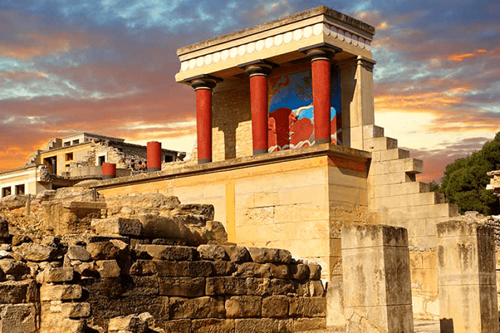 Τα προπύλαια και τα περίφημα Διπλά Κέρατα, ένα από τα ιερά σύμβολα της μινωικής θρησκείας. Στα βασιλικά διαμερίσματα θα δείτε την αίθουσα των «Διπλών Πελέκεων» και το «Διαμέρισμα της Βασίλισσας» με την τοιχογραφία των «Δελφινιών». Το ανάκτορο της Κνωσού άκμασε στη μινωική εποχή (2000-1350 π.Χ.), τότε που υπήρξε το πιο σημαντικό οικονομικό-κοινωνικό και θρησκευτικό κέντρο της Κρήτης.